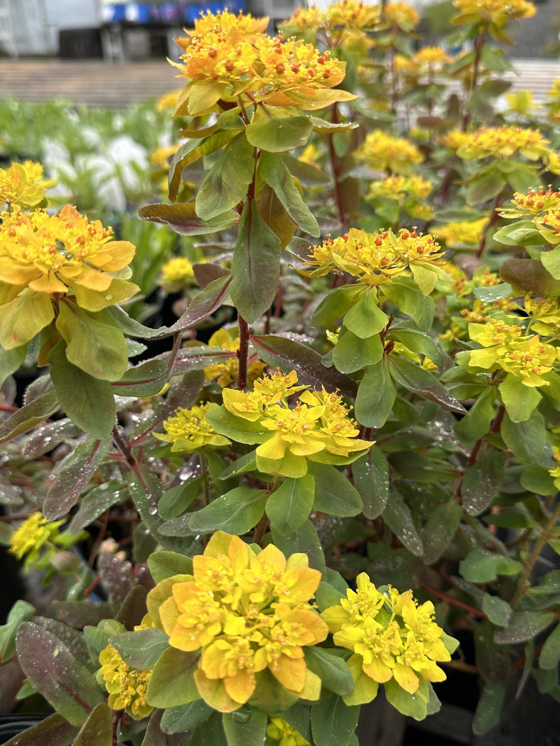 ![]() Euphorbia polychroma 'Bonfire', d'une beauté toute au long de la saison, sans insecte ni maladie.Euphorbe polychrome bonfireWow! quel spectacle débutant très tôt au printemps son feuillage émerge vert puis devient multicolore pourpre, rouge, orange avec une touche de chartreuse. Formation de bractées (ressemblant à une fleur) jaune vif contrastant son magnifique feuillage. En cours de saison son feuillage devient pourpre foncé puis rouge en automne. Tolère les sols secs une fois établie. Zone de rusticité: 4 Dimensions: 45cm haut x 60 cm large Ensoleillement: soleil ou mi-ombre Temps de floraison: bractées au printemps Couleur des fleurs: jjaune vif Couleur du feuillage: multicolore Utilisation: fleurs coupées, haie basse, pot, massif, plate-bande, bordure, rocaille et spécimen. Croissance: rapide Taille: tailler à 10 cm en automne Sol: tolère les sols secs une fois établie