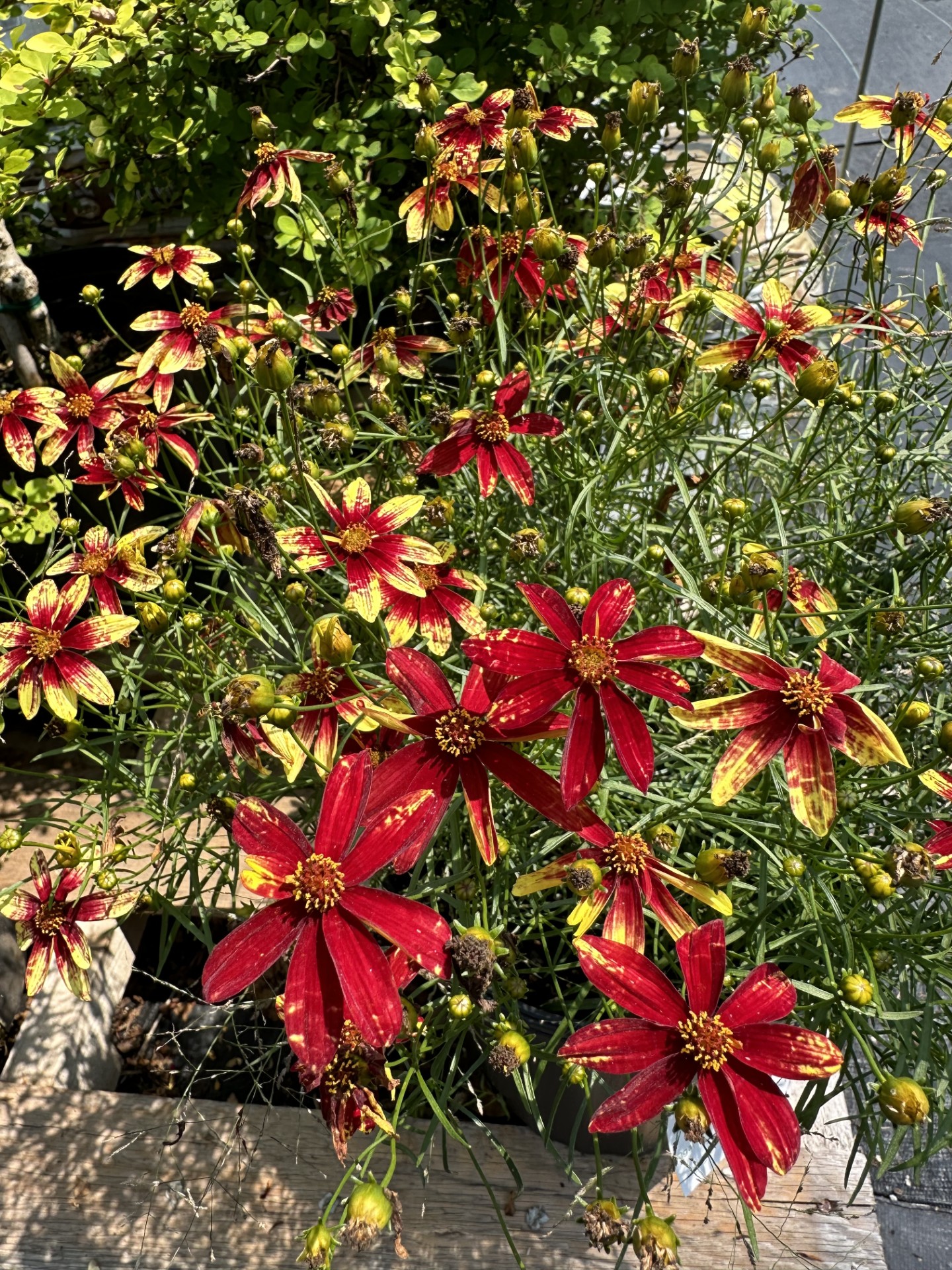 Coreopsis verticillata 'Route 66', fleurit tout l'été, les fleurs changent de couleur en vieillissant.Coréopsis verticillé route 66Vivace originale! Ses fleurs changent de couleur. Multitude de petites fleurs jaunes au halo rouge changeant au rouge sang en vieillissant formant une belle boule de fleurs de différentes couleurs. Délicat feuillage. Attire papillons et pollinisateurs. Zone de rusticité: 4 Dimensions: 60cm haut x 60 cm large Ensoleillement: soleil ou mi-ombre Temps de floraison: fleurit tout l'été Couleur des fleurs: jaunes et rouges chaangeant au rouge sang. Couleur du feuillage: vert Utilisation: plate-bande, massif, haie basse, pot, et fleurs coupées. Croissance: rapide Taille: tailler à 10 cm en automne Sol: frais et bien drainé. Arrosage: ne pas laisser sécher complètement.