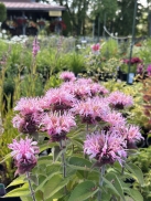Monarda didyma 'Pardon My Cerise',miniature, feuilles et fleurs odorantes, résistant aux cerfs. Nom commun: Monarde pardon my cerise