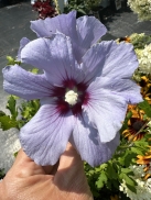 Hibiscus syriacus 'L'oiseau Bleu', arbuste à la floraison spectaculaire et successive jusqu'en octobre. Nom commun: Hibiscus de Syrie