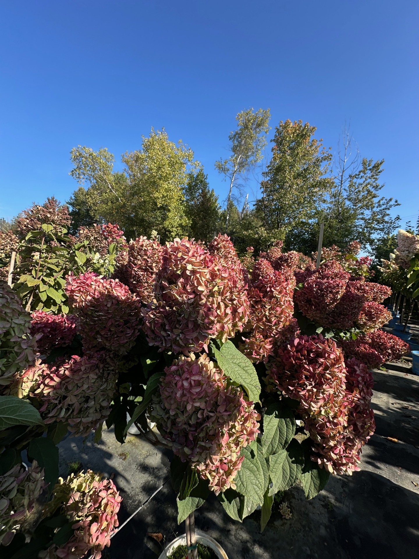 Hydrangea paniculata ' Quick Fire Fab', spectaculaire floraison de juin à octobre.Hydrangée paniculée quick fire fabRemarquable hydrangée à floraison très hâtive de juin jusqu'en octobre. Les panicules de fleurs d'abord blanches, tournent au rose puis au bourgogne très rapidement. Idéal en fleurs coupées ou séchées. Attire les papillons et pollinisateurs. Zone de rusticité: 3 Dimensions: 1.5 à 2 m haut x 1.5 à 2m large Ensoleillement: soleil ou mi-ombre Temps de floraison: juin à octobre Couleur des fleurs: blanches tournant rapidement au rose. Couleur du feuillage: vert Utilisation: plate-bande, écran, alignement le long d'un sentier ou chemin, point focal. Croissance: moyenne Taille: Supprimez les fleurs fanées en automne ou tôt au printemps. Sol: frais et bien drainé. Arrosage: garder le sol humide mais non détrempé.