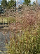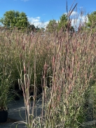Panicum virgatum 'Blood Brothers',étroit, feuillage teinté de rouge, floraison en nuage rougeâtre. Nom commun: Panic érigée blood brothers